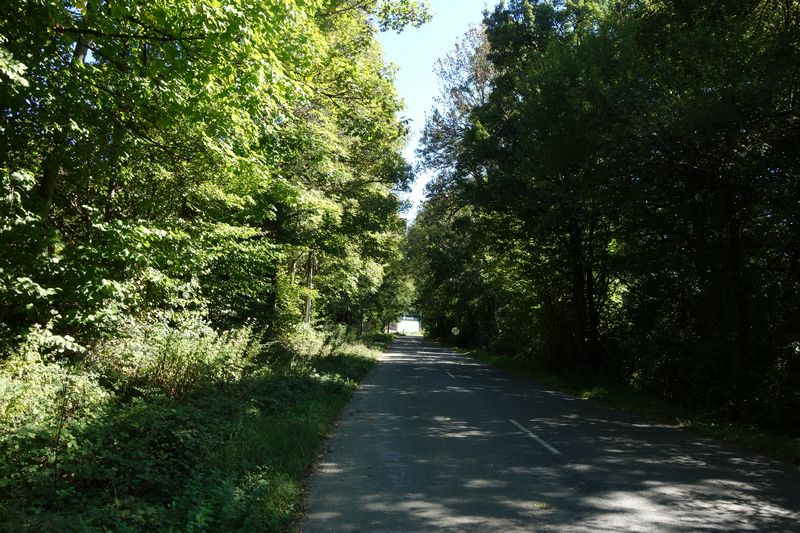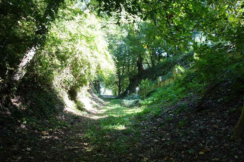 La voie déferrée chemine dans l'herbe de l'accotement gauche de la