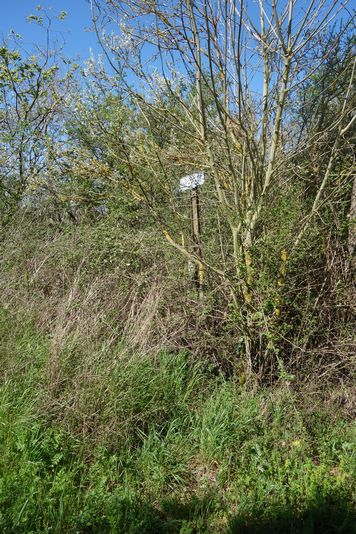 d'un passage à niveau, dont il ne reste plus, dans les fourrés, que la plaque