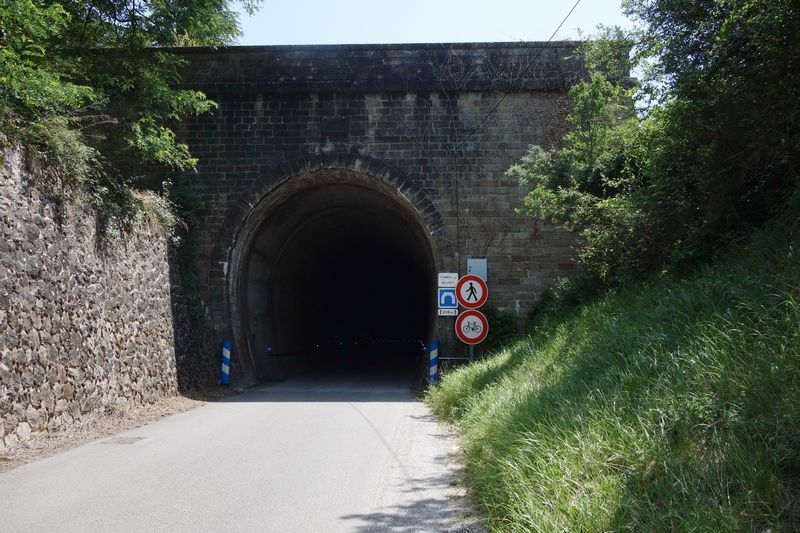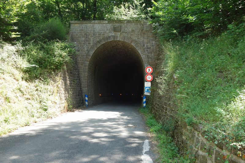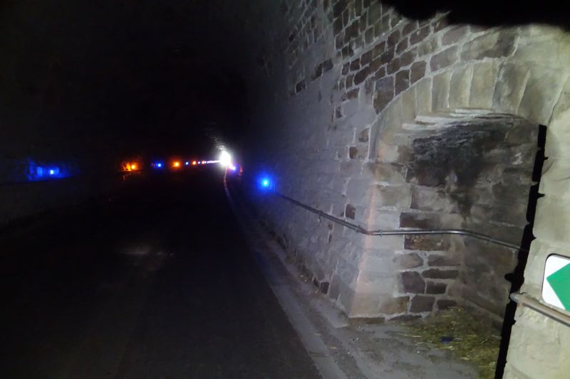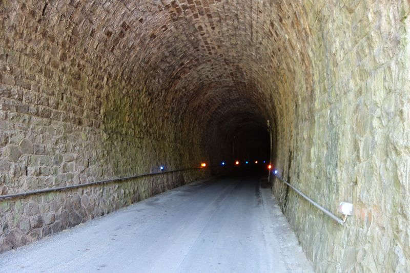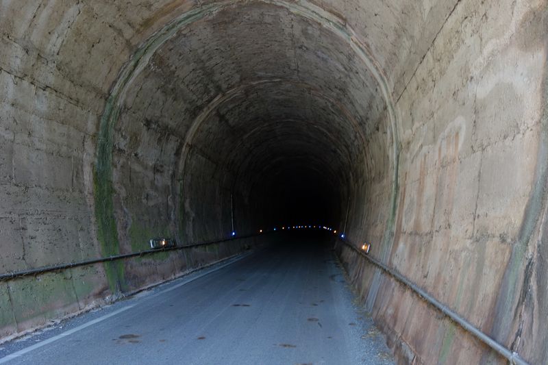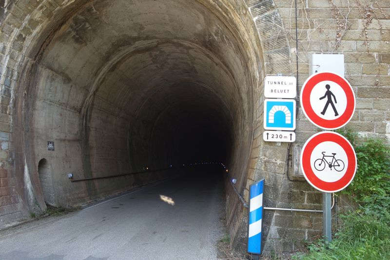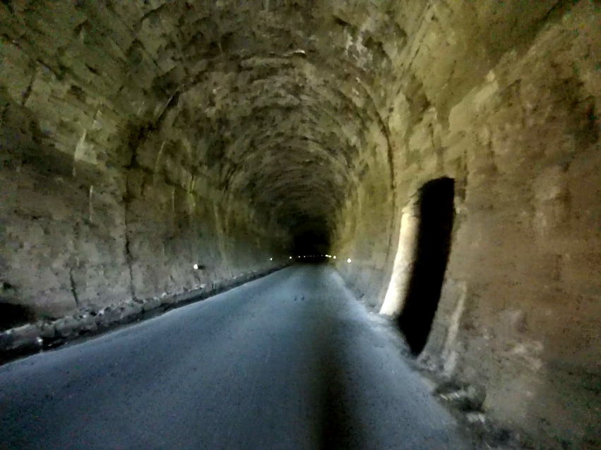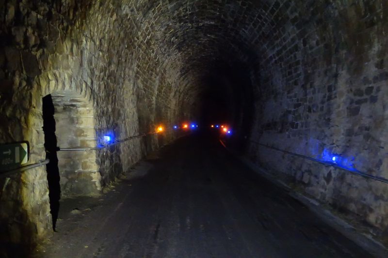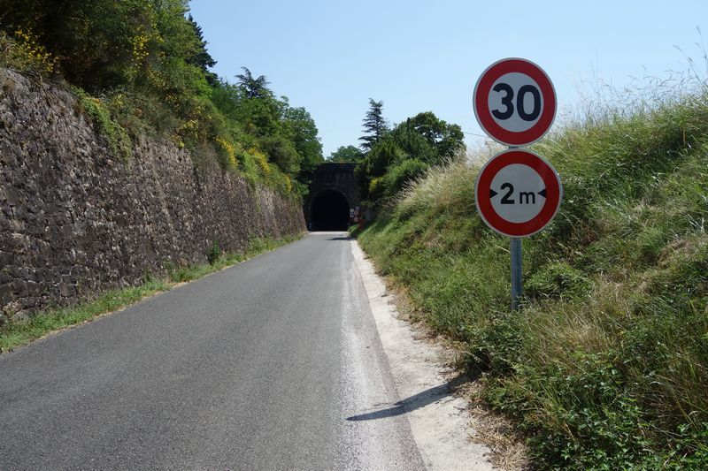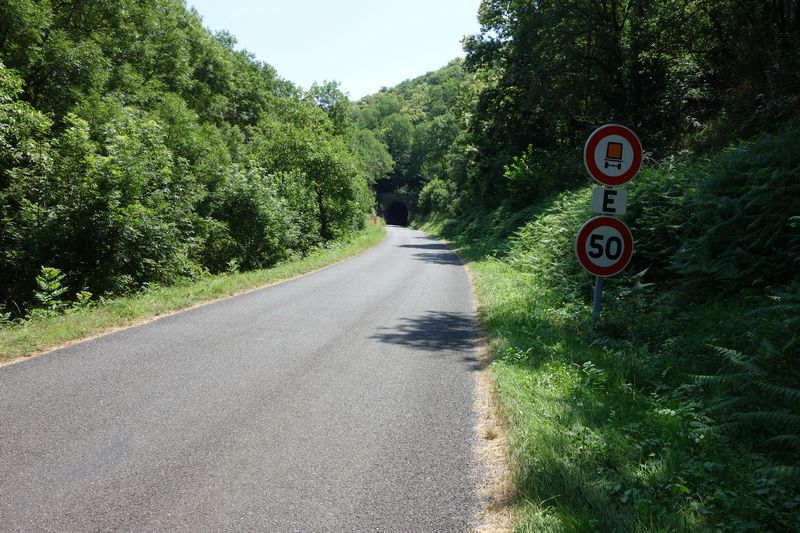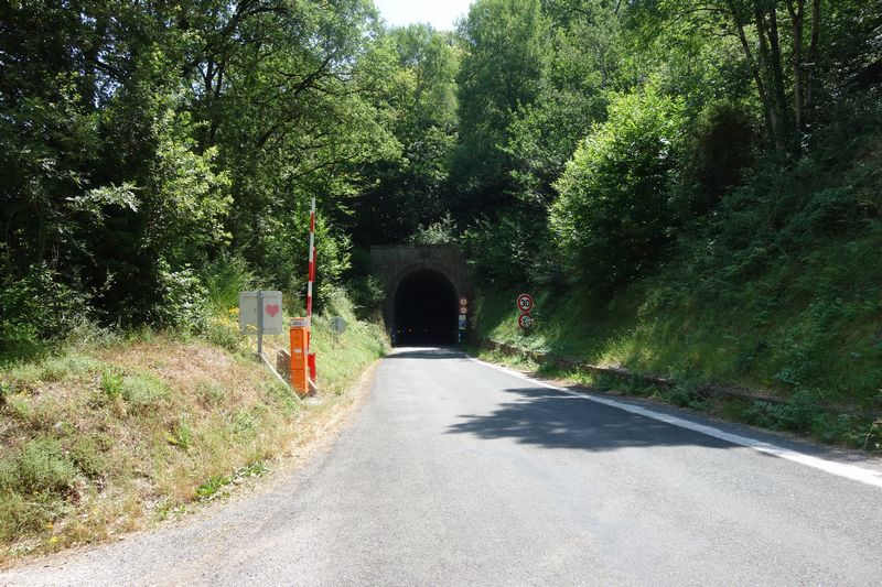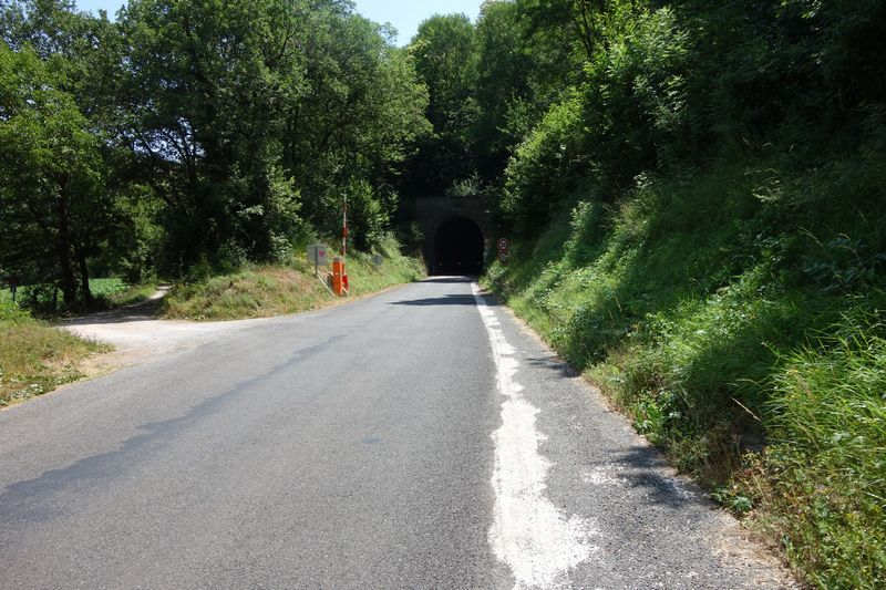 La D 200 s'avance vers la bouche obscure d'un souterrain.