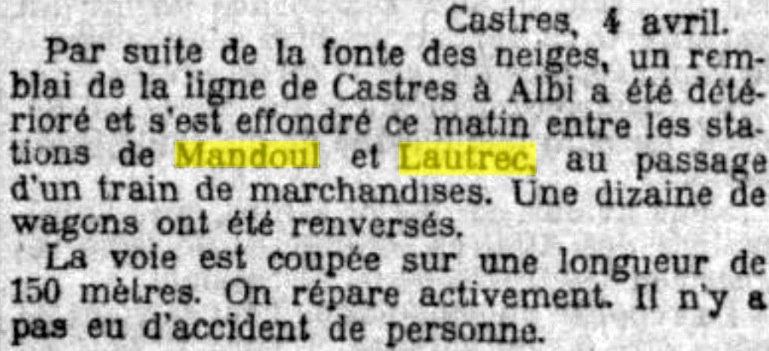 Il est demandé et exécuté la démolition de la gare de Lautrec, au profit d'une coopérative d'agriculteurs. 1891
